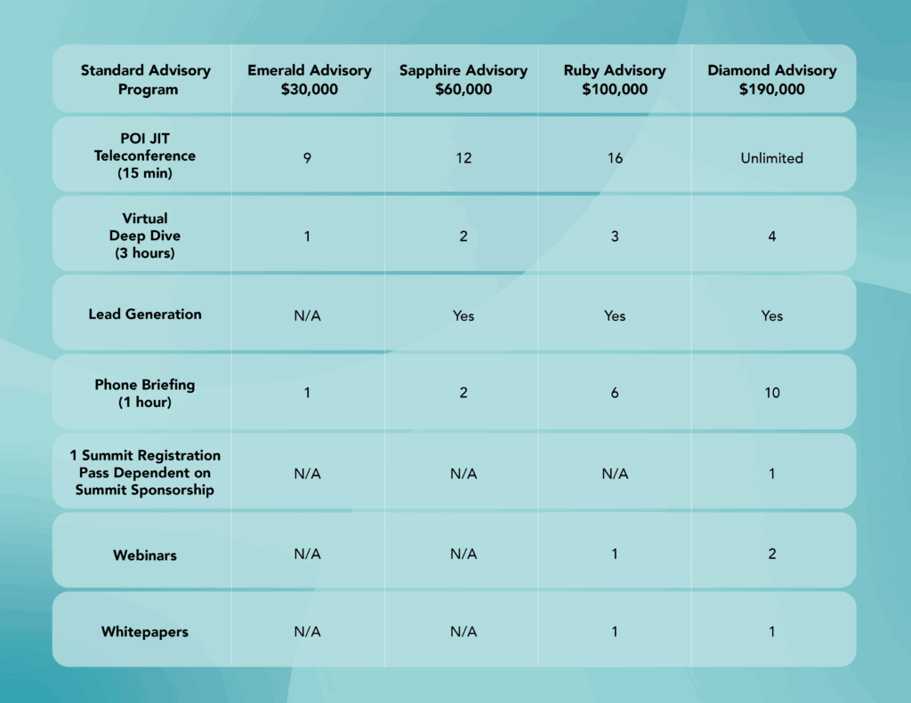 POI is open to discussing advisory customization options that best fits your business needs. For example, if you desire additional advisory briefings vs. a Standard Deep Dive, we can work together to create a custom package. Any element of a higher-level sponsorship may be added at an additional cost (e.g. Additional deep dive sessions, user group keynote/presentations, etc.).